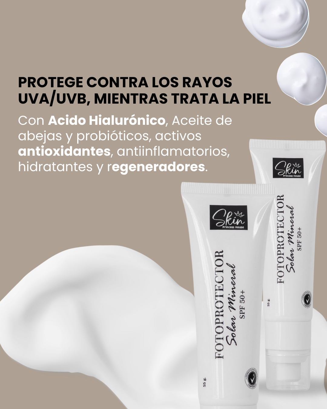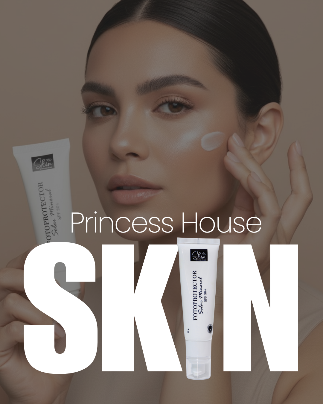 El Fotoprotector Mineral SPF 50+ Princess Skin es la solución definitiva para protección solar natural completa contra rayos UVA y UVB dañinos. Su fórmula dermatológica avanzada con pantallas solares minerales óxido de zinc y dióxido de titanio ofrece protección inmediata sin irritar la piel más sensible, mientras que su textura ligera se absorbe completamente sin dejar residuos blancos antiestéticos en rostro y cuerpo.